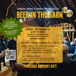 SVT's Second Annual Beer in the Barn Fundraiser will feature beer from Amory's Tomb, hot dogs from Ye' Olde Farm Stand, and live music by Red Horse Old-time Duo.