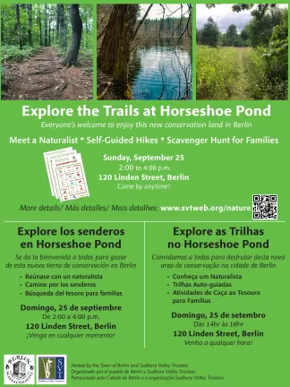 Sudbury Valley Trustees (SVT por sus siglas en inglés) y el pueblo de Berlin han colaborado conjuntamente para proteger 100 acres de tierras en el rincón noreste de Mount Pisgah llamado Horseshoe Pond. Esta tierra incluye una laguna, una pradera, un bosque y senderos abiertos al público para su goce entre el amanecer y el anochecer. SVT es un grupo sin fines de lucro que conserva tierras para el goce del público en la región entre Boston y Worcester.