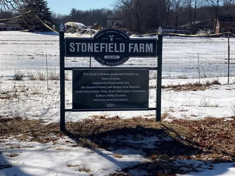 A sign near the corner of Stow Street and Martin Street proclaims the success of the collaborative effort in 2021 that protected the property with an Agricultural Preservation Restriction.