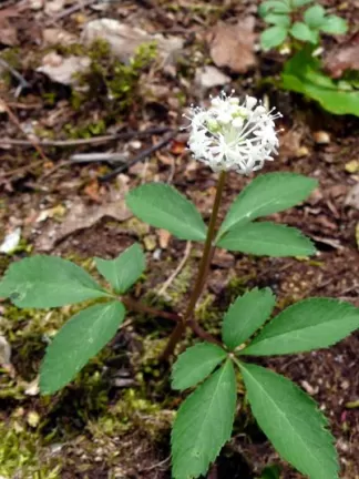 Dwarf ginseng is a small wildflower that produces an umbel of white petals. It was originally used by Native Americans as a medicinal plant due to its pain-relieving properties.