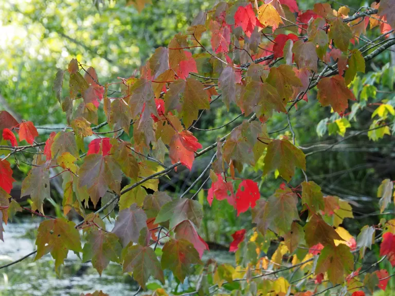 The area surrounding the inner loop trail is called a red maple swamp and is a perched wetland. Red maple (Acer rubrum), which is found in abundance in this area, is adaptable and capable of growing in many different conditions. Also referred to as "swamp maple" due to its tendency to grow in wet swampy environments, the red maple is an important plant along riparian buffers. Although it is one of the most prevalent trees in the northeast, it is susceptible to disease and defects, so its timber quality is low.